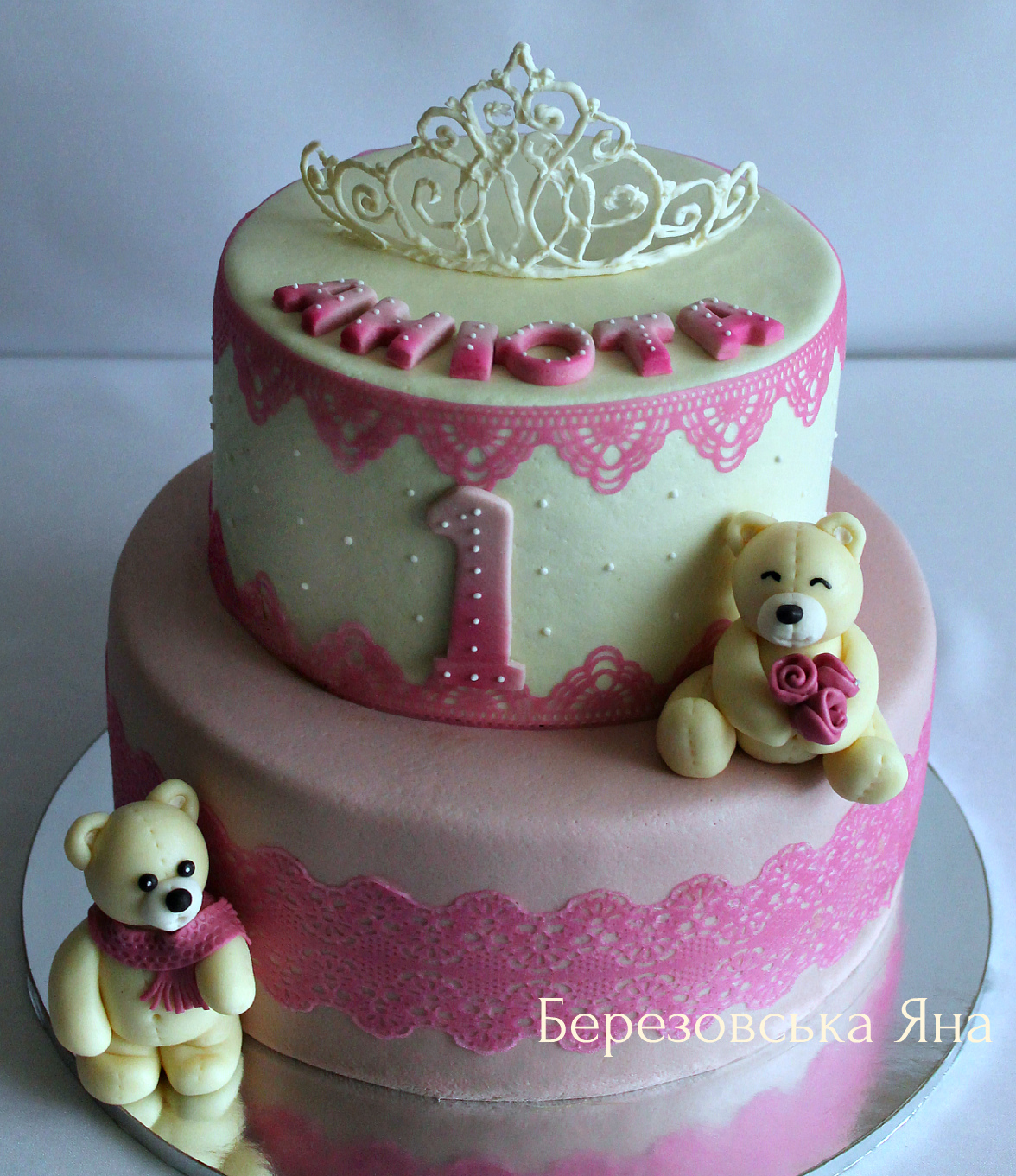 Верхний ярус - Молочная девочка с вишневой прослойкой, нижний - Суфле с профитролями. Вес 5,5 кг